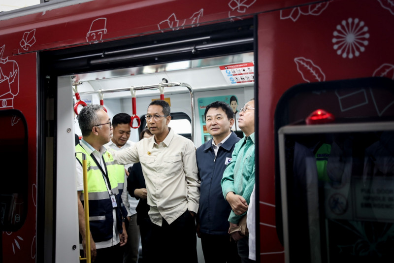 Penjabat (Pj) Gubernur DKI Jakarta, Heru Budi Hartono bersama Menteri Agraria, Infrastruktur dan Transportasi Korea Selatan, Won Hee-ryong menaiki kereta Light Rail Transit (LRT) Jakarta fase 1A dari Stasiun LRT Velodrome sampai Stasiun LRT Pegangsaan Dua, Jumat (16/3). Kunjungan Menteri Won Hee-ryong tersebut untuk mengikuti lelang konstruksi proyek LRT Jakarta fase 1B rute Velodrome-Manggarai dengan panjang lintasan 6,3 kilometer yang akan dimulai pada pertengahan tahun ini. (Foto: Nugroho Sejati/beritajakarta.id)