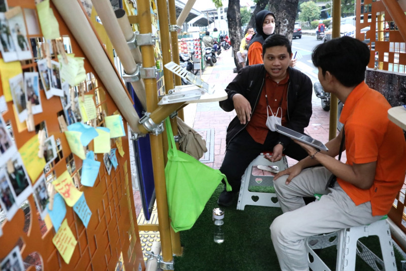 Melihat Instalasi Instabooth Transit Operation Development (TOD), Pedestrian Operation Development (POD) di Stasiun Klender lama, Jalan I Gusti Ngurah Rai, Klender, Duren Sawit, Jakarta Timur, Kamis (16/3). Booth ini merupakan hasil kerjasama Pemprov DKI Jakarta dengan tim Kemitraan Indonesia Australia Untuk Infrastruktur (KIAT) untuk menghimpun aspirasi masyarakat dalam perencanaan pembangunan transportasi umum serta membuat masyarakat merasa aman dan nyaman saat berjalan kaki di trotoar. (Foto: Mochamad Tresna Suheryanto/beritajakarta.id).