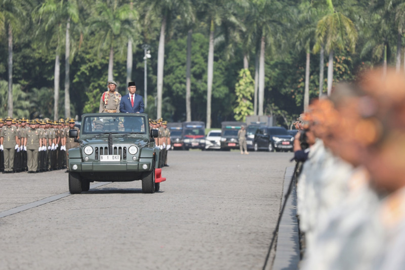 Penjabat (Pj) Gubernur DKI Jakarta, Heru Budi Hartono menjadi Inspektur dalam Upacara Hari Ulang Tahun Satuan Polisi Pamong Praja (Satpol PP) dan Satuan Perlindungan Masyarakat (Satlinmas) di Silang Monas Selatan, Gambir, Jakarta Pusat, Kamis (16/3). Pada peringatan hari ulang tahun ke-73 dan ulang tahun ke-61, Satpol PP dan Satlinmas diharapkan dapat mewujudkan Jakarta sebagai wilayah tertib dan ramah investasi melalui Satpol PP dan Satlinmas yang profesional dan humanis. (Foto: Nugroho Sejati/beritajakarta.id)