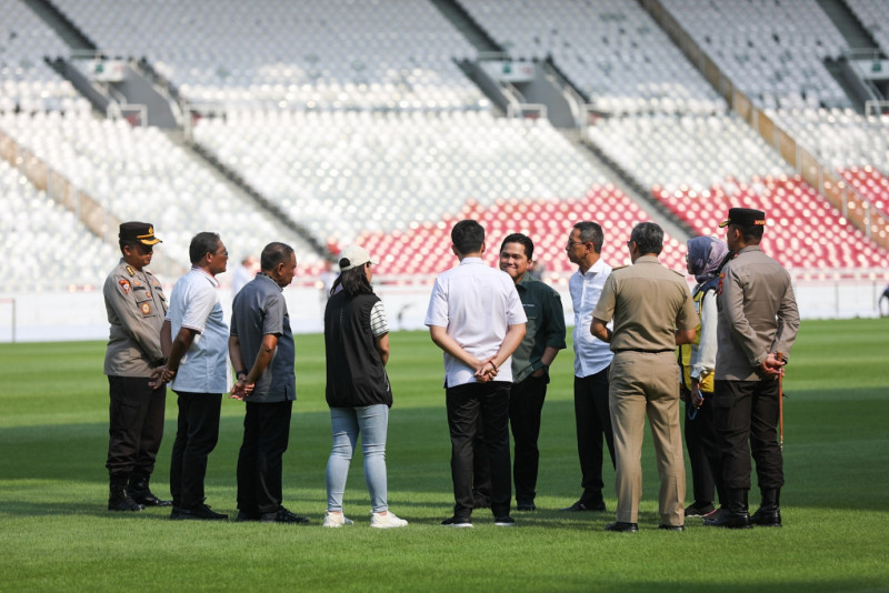 Penjabat (Pj) Gubernur DKI Jakarta, Heru Budi Hartono bersama Menteri BUMN sekaligus Ketua Umum PSSI, Erick Thohir, meninjau lapangan Stadion Utama Gelora Bung Karno (SUGBK) di Jakarta Pusat, Senin (13/3). Sebagai salah satu tuan rumah, Pemerintah Provinsi DKI Jakarta memastikan siap mendukung pelaksanaan Piala Dunia U-20 yang akan berlangsung pada 20 Mei hingga 11 Juni 2023. (Foto: Nugroho Sejati/beritajakarta.id)