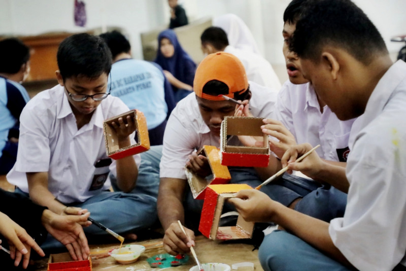 Suku Dinas Kebudayaan Jakarta Pusat menggelar pelatihan seni rupa kriya bagi penyandang disabilitas di Gedung Pusat Pelatihan Seni Budaya (PPSB) M Mashabi, Jalan KH Mas Mansyur, Tanah Abang, Jakarta Pusat, Senin (13/3). Para peserta diajarkan membuat seni kriya dalam bentuk kap lampu berbahan dasar kertas karton dan stik es krim. Pelatihan dimulai dari tanggal dua hingga 15 Maret 2023 diikuti 30 peserta disabilitas terdiri dari Tunarungu dan Tunagrahita yang berasal dari Sekolah Luar Biasa (SLB) yang ada di Jakarta Pusat. (Foto: Mochamad Tresna Suheryanto/beritajakarta.id)