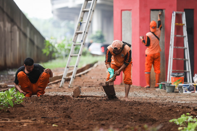 Petugas Penanganan Prasarana dan Sarana Umum (PPSU) Kelurahan Cipinang Cempedak menata area kolong Tol Becakayu di Jalan D.I. Panjaitan, Kecamatan Jatinegara, Jakarta Timur, Kamis (2/3). Penataan dengan mengecat pilar-pilar dengan motif vertikal warna-warni dan penanaman sejumlah tanaman hias bertujuan untuk memperindah kawasan kolong Tol Becakayu dan memberikan kesan bersih bagi pengguna jalan. (Foto: Nugroho Sejati/beritajakarta.id)