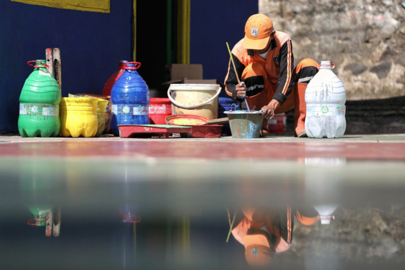 Petugas Penanganan Prasarana dan Sarana Umum (PPSU) Kelurahan Bangka melakukan pengecatan kawasan menjadi kampung warna di Jalan Kemang IE RT 13/05, Kelurahan Bangka, Mampang Prapatan, Jakarta Selatan. Kampung Warna ini adalah bagian dari penataan kawasan unggulan triwulan I Jilid II di wilayah Kelurahan Bangka, terdapat 30 rumah dan sejumlah tembok jalan dicat dengan berbagai macam warna cerah. (Foto: Andri Widiyanto/beritajakarta.id)