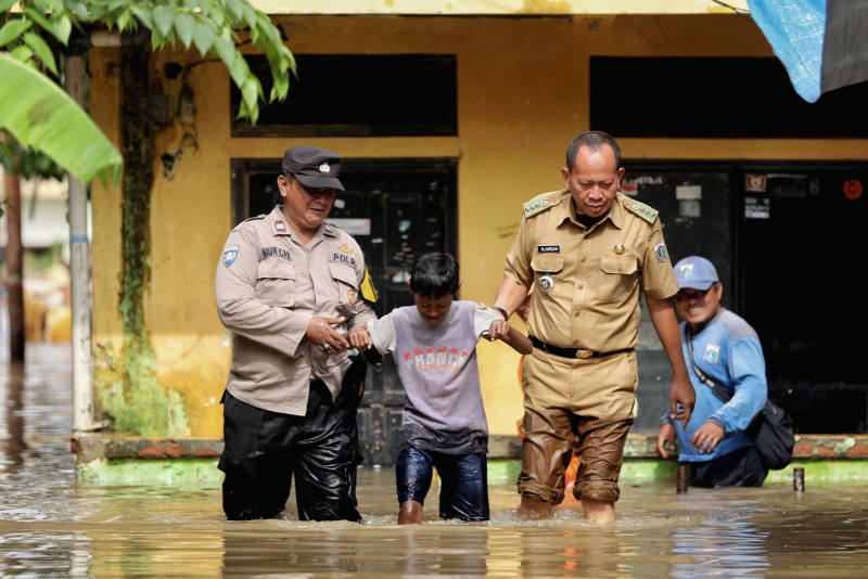 Sejumlah petugas gabungan dari BPBD DKI Jakarta, PPSU Kelurahan Kampung Melayu, Sudin SDA Jakarta Timur dan personel kepolisian menangani banjir di RT 13 RW 04, Kampung Melayu, Jatinegara, Jakarta Timur, Senin (27/2). Banjir setinggi 1-2 meter yang merendam dua RT di Kampung Melayu terjadi akibat luapan Kali Ciliwung disertai curah hujan tinggi. (Foto: Nugroho Sejati/beritajakarta.id)