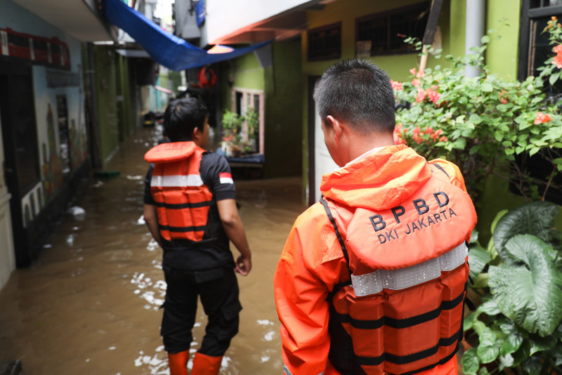 Camat Pancoran, Alamsyah bersama PPSU Kelurana Rawajati dan Satuan Pelaksana Sumber Daya Air (Satpel SDA) Kecamatan Pancoran meninjau genangan di Jalan Bina Warga, Kelurahan Rawajati, Pancoran, Jakarta Selatan, Senin (27/2). Camat menghimbau warga yang ingin mengungsi Tersedia posko tanggap bencana yang berada di Kantor Kelurahan Rawajati dan Kantor Kecamatan Pancoran. (Foto: Andri Widiyanto/beritajakarta.id)