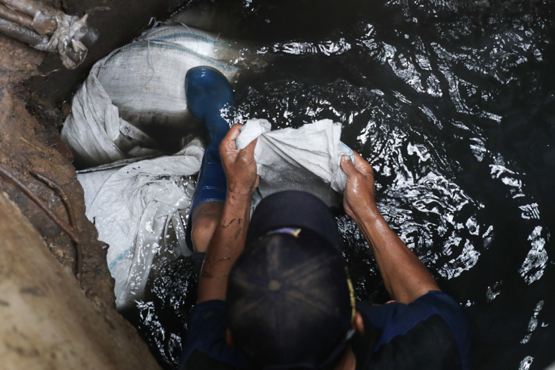Sejumlah petugas Suku Dinas Sumber Daya Air (Sudin SDA) Jakarta Pusat menguras saluran di Jalan Haji Agus Salim, Kelurahan Gondangdia, Menteng, Jakarta Pusat, Senin (27/2). Pengurasan yang saluran sepanjang 12 meter yang dikerjakan oleh lima petugas Sudin SDA Jakpus tersebut untuk menambah kapasitas saluran serta mencegah genangan. (Foto: Nugroho Sejati/beritajakarta.id)