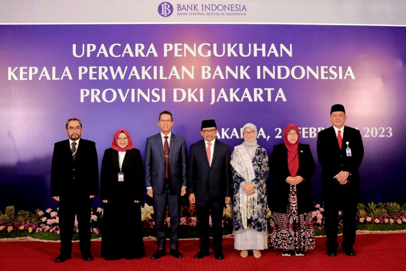 Penjabat (Pj) Gubernur DKI Jakarta, Heru Budi Hartono menghadiri upacara pengukuhan Kepala Perwakilan Bank Indonesia Provinsi DKI Jakarta, di Kantor Perwakilan Bank Indonesia Provinsi DKI Jakarta di Jalan Prajurit KKO Usman dan Harun, Jakarta Pusat, Jumat (24/2). Dalam upacara pengukuhan ini Arlyana Abubakar diangkat sebagai Kepala Perwakilan Bank Indonesia Provinsi DKI Jakarta menggantikan Onny Widjanarko. (Foto: Andri Widiyanto/beritajakarta.id)