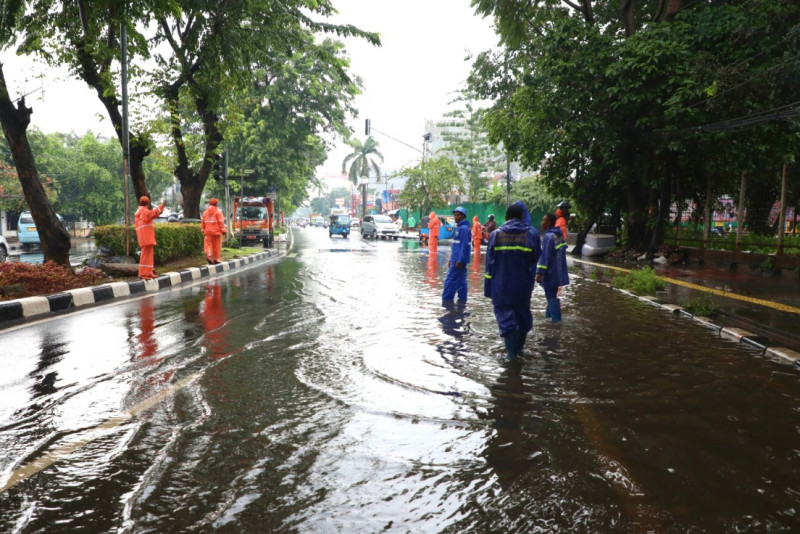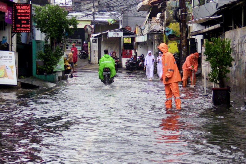 Petugas Penanganan Prasarana dan Sarana Umum (PPSU) Kelurahan Tegal Parang menangani genangan di Jalan Tegal Parang I, Mampang Prapatan, Jakarta Selatan, Jumat (24/2). Genangan setinggi 30-40 sentimeter yang terjadi pada pagi hari tersebut berhasil surut sekitar pukul 11.00. (Foto: Nugroho Sejati/beritajakarta.id)