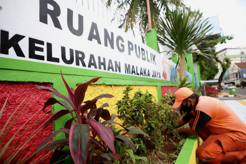 Petugas Penanganan Prasarana dan Sarana Umum (PPSU) Kelurahan Malaka Jaya melakukan penataan kawasan unggulan di Jl Mawar Merah Raya, No.01, Rt.13, Rw.03, Malaka Jaya, Duren Sawit, Jakarta Timur, Senin (20/2). Kawasan yang dulunya tak terawat kini dihiasi dengan berbagai tanaman hias dan mural-mural yang bertemakan DKI Jakarta. (Foto: Mochamad Tresna Suheryanto/beritajakarta.id)