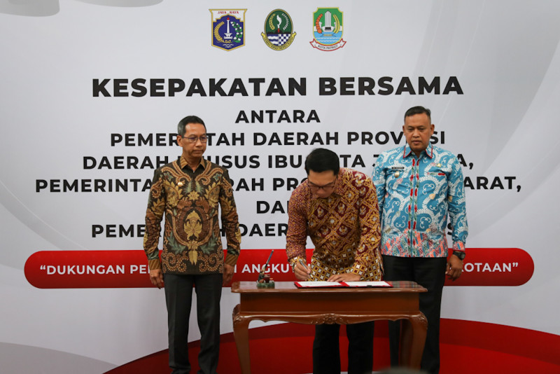 Penjabat (Pj) Gubernur DKI Jakarta, Heru Budi Hartono bersama Gubernur Jawa Barat, Ridwan Kamil dan Plt Wali Kota Bekasi, Tri Ardhianto menandatangani perjanjian kerja sama (MoU) antara Pemprov DKI Jakarta, Pemprov Jawa Barat dan Pemkot Bekasi di Kantor Gubernur Provinsi Jawa Barat, Jumat (17/2). Penandatanganan perjanjian kerja sama tersebut terkait pembangunan angkutan umum massal perkotaan Mass Rapid Transit (MRT) yang melintasi Provinsi Jawa Barat. (Foto: Nugroho Sejati/beritajakarta.id)
