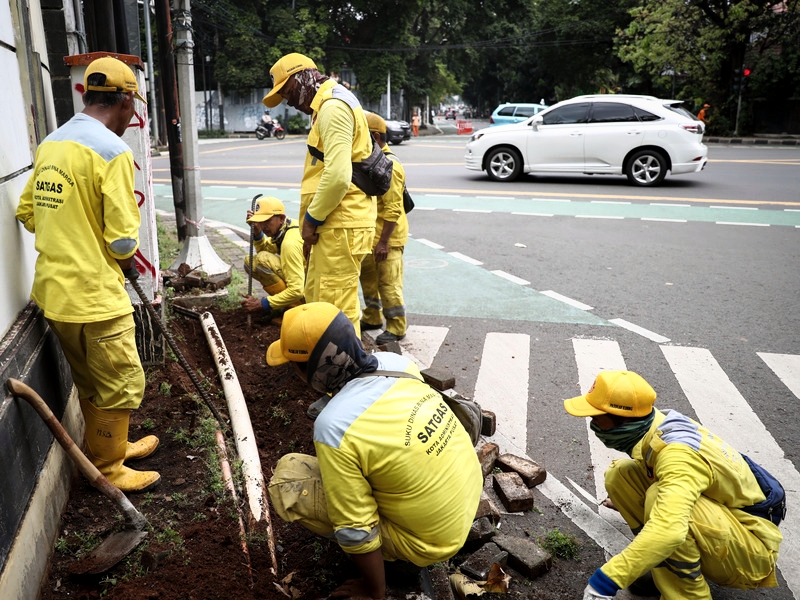 Petugas satuan pelaksana (Satpel) Bina Marga Kecamatan Menteng melakukan perbaikan trotoar di Jl Taman Suropati Menteng, Jakarta Pusat, Jumat (10/2). Perbaikan trotoar sepanjang 11 meter dengan lebar 1,50 meter ini dilakukan karena adanya aduan warga karena trotoar sudah rusak. (Foto: Mochamad Tresna Suheryanto/beritajakarta.id)