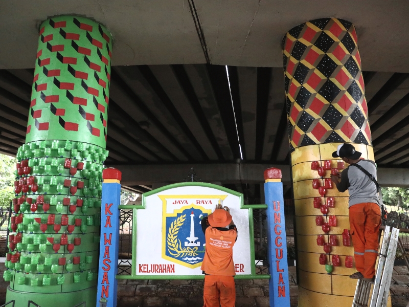 Untuk menghilangkan kesan kumuh petugas Penanganan Prasarana dan Sarana Umum (PPSU) Kelurahan Klender mempercantik Kolong Flyover (FO) Klender dengan vertical garden, mural dan cat warna warni di setiap tiang-tiang Flyover, Sabtu (11/2). Uniknya pembuatan vertical garden ini menggunakan bekas botol plastik yang menjadi wadah tanaman. (Foto: Mochamad Tresna Suheryanto/beritajakarta.id)