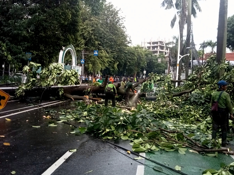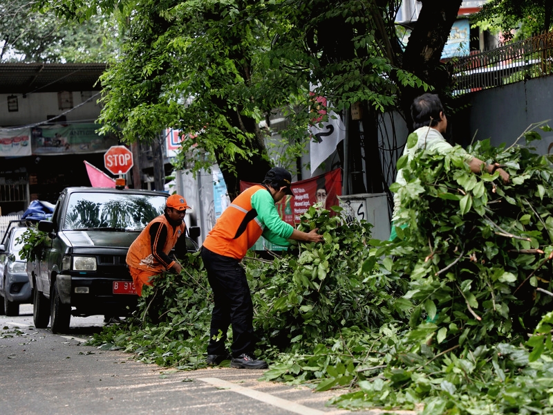 Petugas gabungan yang terdiri dari unsur Penanganan Prasarana dan Sarana Umum (PPSU), Dinas Pertamanan dan Hutan Kota (Distamhut), Dinas Lingkungan Hidup (DLH) dan Satuan Polisi Pamong Praja (Satpol PP) melakukan evakuasi pohon tumbang di Jalan Bangka VIII, Mampang Prapatan, Jakarta Selatan, Kamis (9/2). Pohon tumbang tersebut terjadi sekitar pukul 11:00 akibat hujan disertai angin kencang. (Foto:Andri Widiyanto/beritajakarta.id)