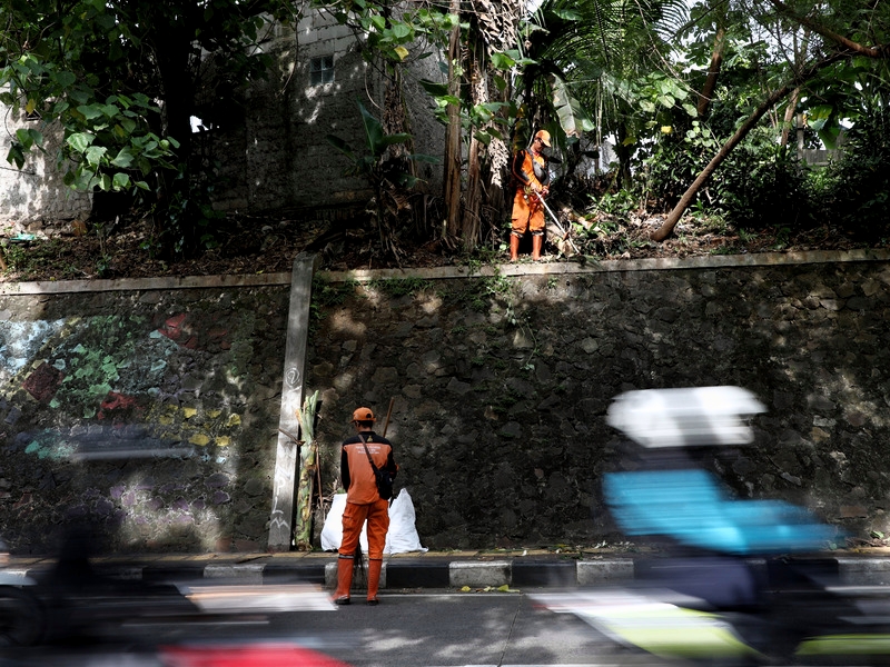 Petugas Penanganan Prasarana dan Sarana Umum (PPSU) Srengseng Sawah membersihkan tanaman liar di sisi Jalan Lenteng Agung Raya, Jagakarsa, Jakarta Selatan, Selasa (7/2). Upaya itu dilakukan guna menjaga agar jalan tetap terlihat bersih dan rapi demi kenyamanan pengendara yang melintasi kawasan tersebut. (Foto:Andri Widiyanto/beritajakarta.id)