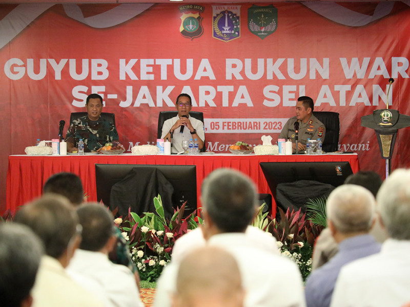 Penjabat (Pj) Gubernur DKI Jakarta, Heru Budi Hartono bersama Kapolda Metro Jaya, Irjen Pol Fadil Imran dan Pangdam Jaya, Mayjen TNI Untung Budiharto menghadiri Guyub Ketua Rukun Warga (RW) se-Jakarta Selatan di Ballroom Mall Boutique, Kuningan Timur, Setiabudi, Minggu (5/1). Pada kesempatan itu, Heru mengimbau seluruh perangkat RT/RW, Bhayangkara Pembina Keamanan dan Ketertiban Masyarakat (Bhabinkamtibmas), dan Bintara Pembina Desa (Babinsa) agar menjaga keamanan, kebersihan, serta melayani masyarakat dengan baik. (Foto: Mochamad Tresna Suheryanto/beritajakarta.id)