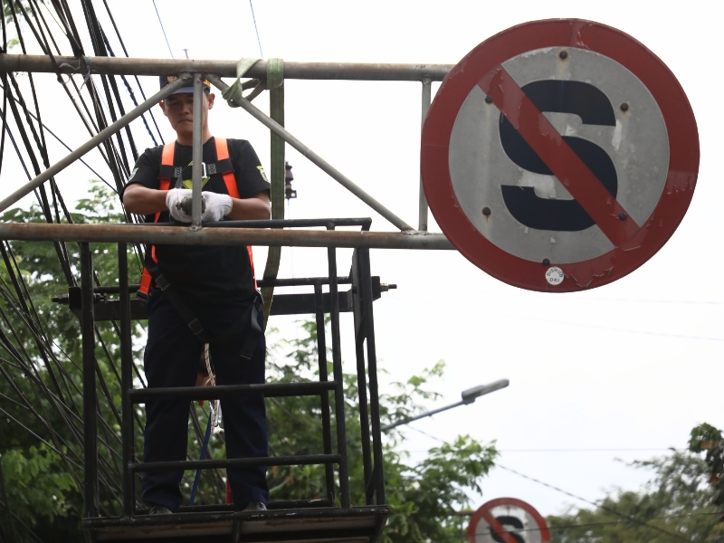 Enam personel dan satu unit truk crane dikerahkan Suku Dinas Perhubungan (Sudinhub) Jakarta Selatan untuk mengevakuasi tiang rambu lalu lintas leter S yang rusak di Jalan RC Veteran, Bintaro, Pesanggrahan, Senin (6/2). Evakuasi dilakukan karena tiang lalu lintas sudah miring dan bengkok akibat ditabrak mobil pada hari minggu kemarin.(Foto: Mochamad Tresna Suheryanto/beritajakarta.id)
