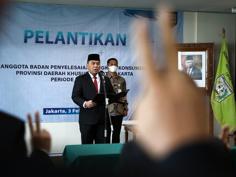 Penjabat Sekretaris Daerah (Pj Sekda) Provinsi DKI Jakarta, Uus Kuswanto melantik sembilan anggota Badan Penyelesaian Sengketa Konsumen (BPSK) DKI Jakarta Periode 2022-2027 di Balai Kota DKI Jakarta, Gambir, Jakarta Pusat, Jumat (3/2). Sembilan anggota BPSK yang dilantik ini terdiri dari unsur pemerintah, unsur konsumen, dan unsur pelaku usaha. (Foto: Nugroho Sejati/beritajakarta.id)