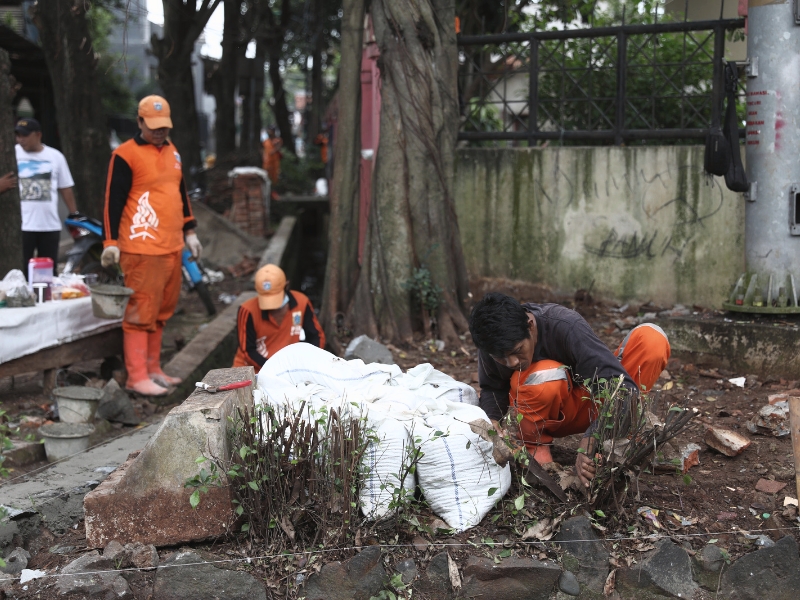 Sebanyak 15 petugas Penanganan Prasarana dan Sarana Umum (PPSU) Kelurahan Setu melakukan penataan kawasan unggulan di depan Gelanggang Remaja Kecamatan Cipayung, Jalan Bantar Jati RT 06/02, Jakarta Timur, Kamis (2/2). Penataan kawasan ini dilakukan yang dulunya lahan tidak sedap dipandang akan diubah menjadi lokasi lebih tertata rapi, asri dan indah dipandang.(Foto: Nugroho Sejati/beritajakarta.id)