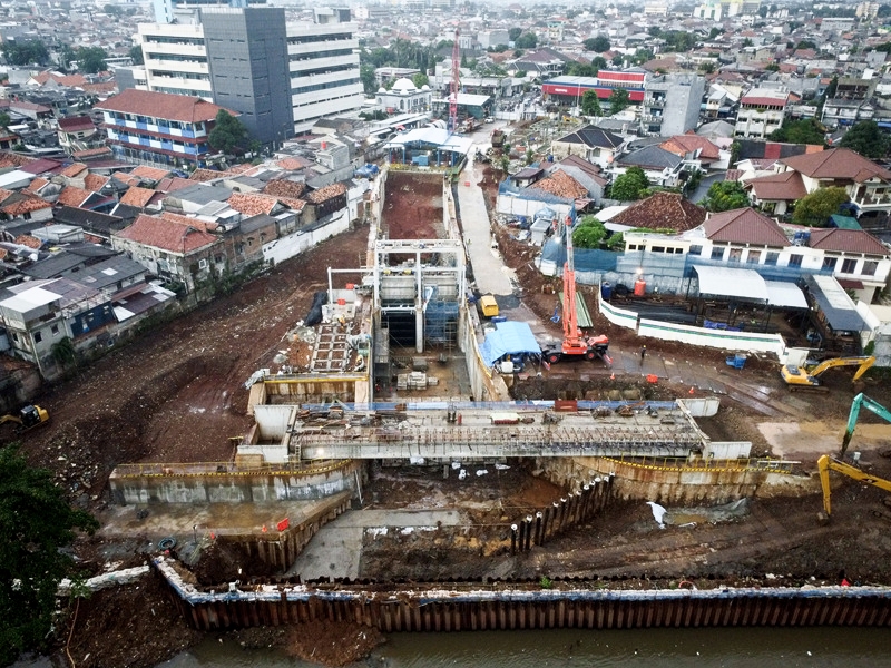 Progres pengerjaan Sodetan Ciliwung di Kecamatan Jatinegara, Jakarta Timur, saat ini mencapai sekitar 92 persen. Para pekerja, Senin (30/1), terus bahu-membahu menyelesaikan proyek yang ditargetkan rampung April mendatang. (Foto: Nugroho Sejati/beritajakarta.id)