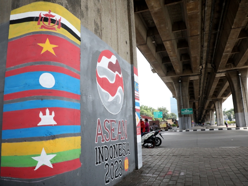 Petugas Penanganan Prasarana dan Sarana Umum (PPSU) Kelurahan Rawa Badak Utara mengecat tiang-tiang bergambarkan lambang ASEAN di kolong Tol Pelabuhan, Jalan Yos Sudarso, Koja, Jakarta Utara, Jumat (27/1). Pengecatan ini dilakukan untuk mempercantik kawasan serta penyambutan para delegasi Konferensi Tingkat Tinggi (KTT) di Jakarta tahun ini.(Photo: Mochamad Treana Suheryanto/beritajakarta.id)