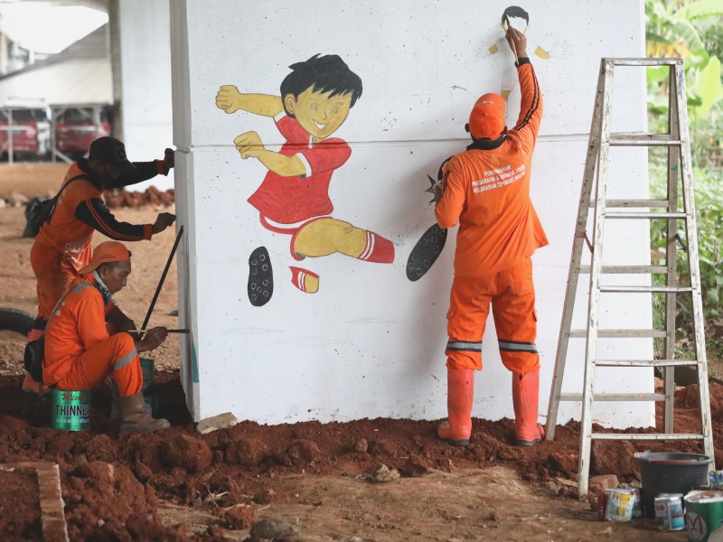 Petugas Penanganan Prasarana dan Sarana Umum (PPSU) Kelurahan Cipinang Melayu, Makasar, Jakarta Timur mempercantik Kolong Tol Becakayu di wilayah RW 01, dengan mural, Kamis (26/1). Pembuatan mural merupakan bagian dari kawasan unggulan Cipinang Melayu dengan tema penghijauan dan olahraga, mural ini dikerjakan sejak Desember lalu dan ditargetkan rampung pada Februari nanti.(Photo: Mochamad Tresna Suheryanto/beritajakarta.id)