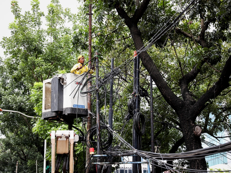 Petugas Dinas Bina Marga DKI Jakarta menertibkan kabel udara sepanjang 1,2 kilometer di Jalan Kebon Sirih, Gambir, Jakarta Pusat, Senin (16/1). Penertiban kebel udara tersebut untuk menambah keindahan dan kerapihan tata ruang kota serta sesuai dengan Peraturan Gubernur (Pergub) Nomor 106 Tahun 2019 tentang Pedoman Penyelenggaraan Infrastruktur Jaringan Utilitas. (Foto: Nugroho Sejati/beritajakarta.id)