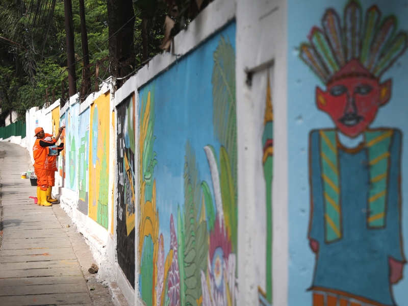 Sejumlah petugas Penanganan Prasarana dan Sarana Umum (PPSU) Kelurahan Kramat Jati melukis mural di tembok sepanjang Jalan Kerja Bakti, Kecamatan Kramat Jati, Jakarta Timur, Selasa (17/1). Mural bertema suasana lingkungan Kramat Jati tersebut mempercantik tembok sepanjang 400 meter dan ditargetkan selesai pada awal bulan Februari 2023. (Foto: Nugroho Sejati/beritajakarta.id)