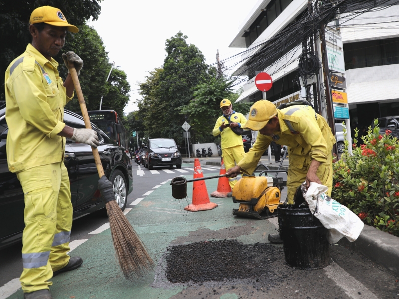 Petugas Satuan Pelaksana (Satpel) Bina Marga memperbaiki empat lubang di depan Stasiun Gondangdia, Jalan Srikaya I, Gondangdia, Menteng, Jakarta Pusat, Selasa (17/1). Kegiatan ini merupakan tindak lanjut aduan warga melalui Cepat Respon Masyarakat (CRM). (Photo: Mochamad Tresna Suheryanto/beritajakarta.id)