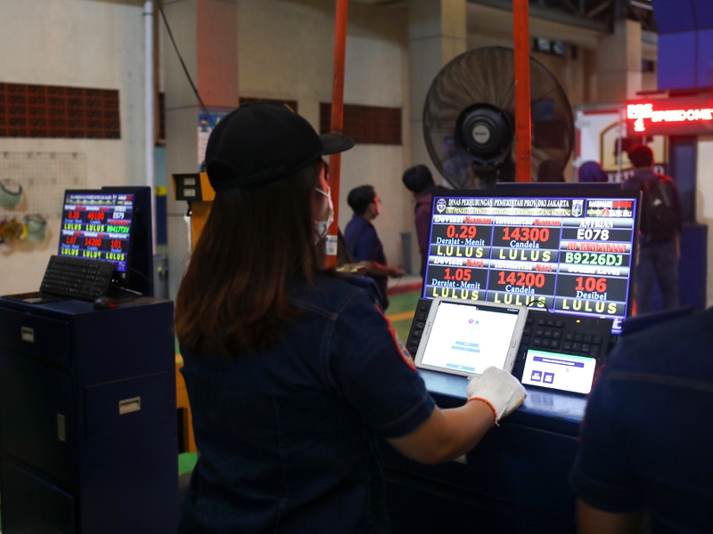 Sejumlah petugas memeriksa kendaraan di Unit Pengelola Pengujian Kendaraan Bermotor (UP PKB) Ujung Menteng,Cakung, Jakarta Timur, Selasa (17/1). Pengujian kendaraan angkutan penumpang dan barang tersebut dipastikan optimal dan bebas dari pungutan liar (pungli). (Foto: Nugroho Sejati/beritajakarta.id)