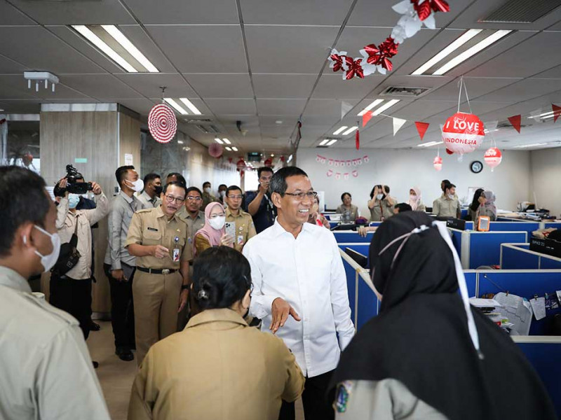 Penjabat (Pj) Gubernur DKI Jakarta, Heru Budi Hartono, melakukan peninjauan ke ruang kerja Aparatur Sipil negara (ASN) di Blok G Balaikota, Selasa (3/1) pagi. Selama kurang lebih 60 menit, Pj Gubernur berkeliling ke lantai 7,14,15, dan 20 untuk bersilahturahmi dan memberikan arahan kepada pegawai. (Foto: Nugroho Sejati/beritajakarta.id)