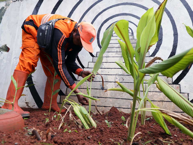 Petugas Penanganan Prasarana dan Sarana Umum (PPSU) melakukan penataan kawasan di Jalan Nangka Raya, RT 07/05, Kelurahan Cipete Utara, Kebayoran Baru, Jakarta Selatan, Selasa (3/1). Pengerjaan meliputi penanaman beragam jenis tanaman serta pembuatan mural untuk meningkatkan estetika. (Foto: Reza Hapiz/beritajakarta.id)
