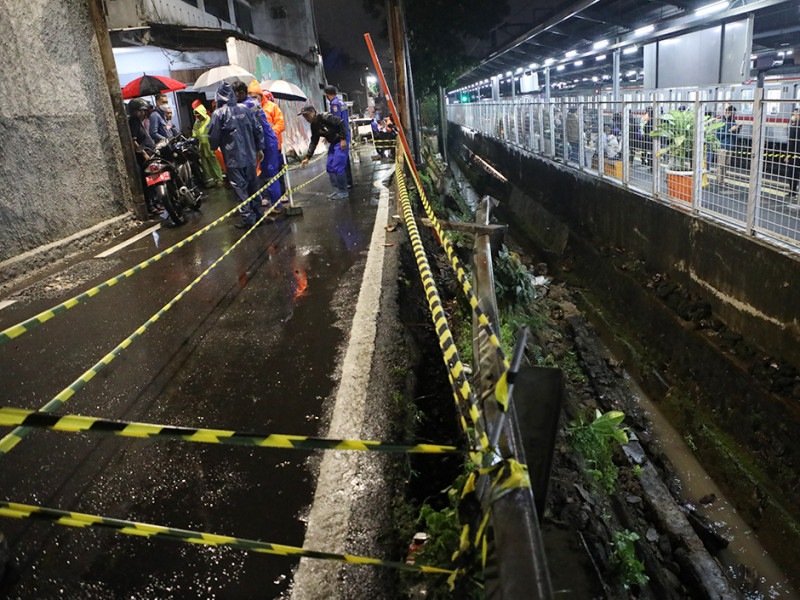 Ruas Jalan Tebet Timur Dalam XI, RT 11/06, Kelurahan Tebet Timur, Tebet, Jakarta Selatan ditutup akibat longsornya turap Saluran Penghubung (Phb) Cawang. Penutupan sementara ini dilakukan demi keamanan pengendara yang hendak melintasi kawasan tersebut. Untuk diketahui, turap Saluran Phb Cawang mengalami longsor sepanjang 15 meter akibat dilanda hujan deras sekitar pukul 17.00 WIB. (Foto: Mochamad Tresna Suheryanto/beritajakarta.id)