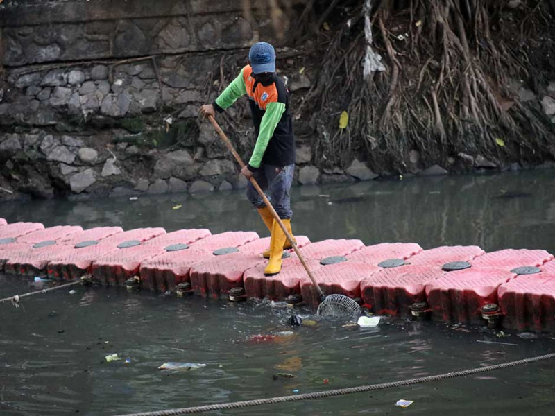 etugas Unit Penanganan Sampah Badan Air (UPSBA) Dinas Lingkungan Hidup DKI Jakarta berjibaku membersihkan sampah di sepanjang aliran Kali Sentiong, Paseban, Senen, Jakarta Pusat, Selasa (3/1). Dalam kegiatan kali ini, sebanyak 24 kubik sampah dari aliran kali Sentiong berhasil diangkut. (Foto: Mochamad Tresna Suheryanto/beritajakarta.id)
