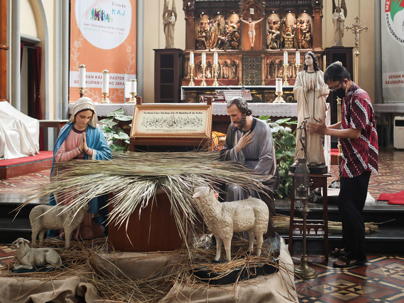 Sejumlah pekerja membersihkan area peribadatan di Gereja Katedral Jakarta, Sawah Besar, Jakarta Pusat, Jumat (23/12). Misa malam Natal di Gereja Katedral Jakarta akan dibagi ke dalam tiga sesi, yaitu sesi pertama pukul 16.30 WIB yang dikhususkan bagi lansia (luring), sesi kedua pukul 19.00 WIB (luring dan daring), dan sesi terakhir pada pukul 21.30 WIB (luring). (Foto: Nugroho Sejati/beritajakarta.id)