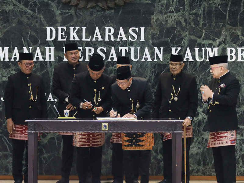 Penjabat (Pj) Gubernur DKI Jakarta, Heru Budi Hartono, menyaksikan serta menandatangani deklarasi Majelis Amanah Persatuan Kaum Betawi di Balai Agung, Balai Kota DKI Jakarta, Gambir, Jakarta Pusat, Kamis (22/12). Deklarasi tersebut menyatukan dua organisasi Betawi, yaitu Badan Musyawarah (Bamus) Betawi dan Bamus Suku Betawi 1982. (Foto: Nugroho Sejati/beritajakarta.id)