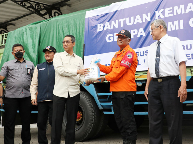 Penjabat (Pj) Gubernur DKI Jakarta, Heru Budi Hartono, melepas keberangkatan truk berisi bantuan kemanusiaan bagi penyintas gempa bumi Cianjur, Jawa Barat. Prosesi pelepasan keberangkatan dilakukan di halaman Pendopo Balai Kota DKI Jakarta, Rabu (14/12).(Foto: Mochamad Tresna Suheryanto/beritajakarta.id)
