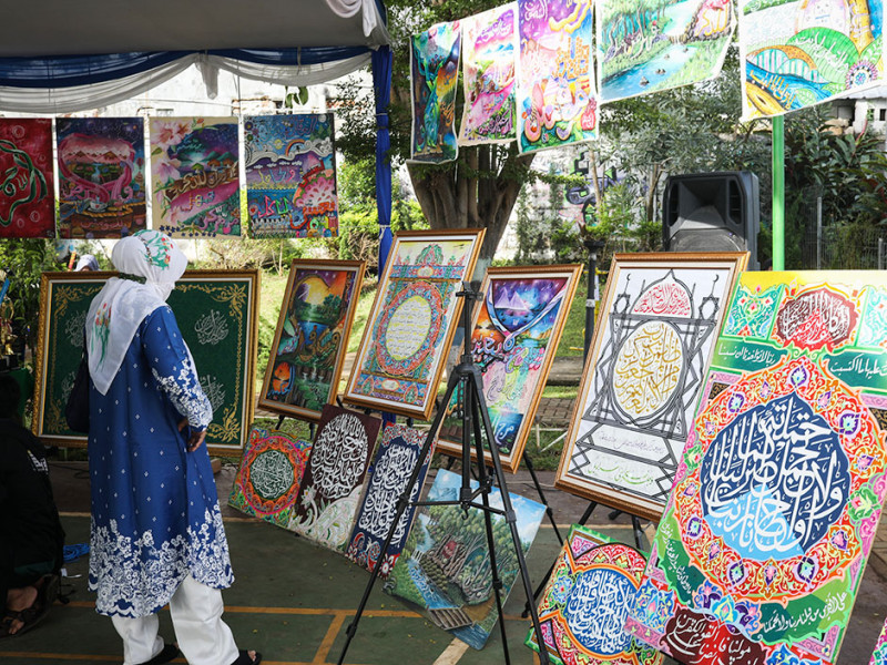Ratusan siswa Madrasah Ibtidaiyah (MI) dan Madrasah Tsanawiyah (MTs) Yayasan Nurul Amal memamerkan karya seni kaligrafi di Ruang Publik Terpadu Ramah Anak (RPTRA) Mustika, Kecamatan Kramat Jati, Jakarta Timur, Selasa (13/12). Pameran bertema `Merawat Warisan Seni Islam dalam Bingkai Lukisan Kaligrafi` ini berlangsung selama dua hari pada 13-14 Desember 2022. (Foto: Nugroho Sejati/beritajakarta.id)