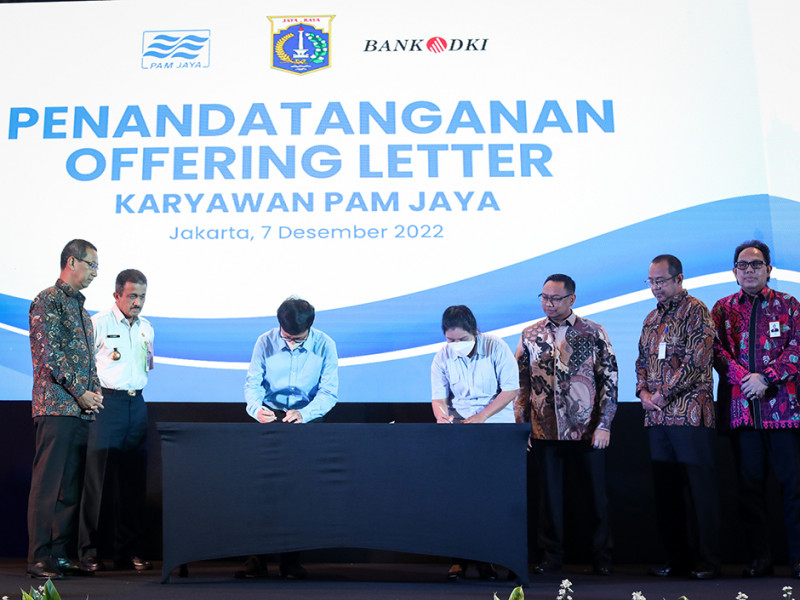 Perwakilan karyawan Palyja dan Aetra menandatangani offering letter ke Perumda Perusahaan Air Minum (PAM) Jaya. Acara penandatanganan berlangsung di Jakarta International Equestrian Park, Jakarta Timur, Rabu (7/12), disaksikan Penjabat (Pj) Gubernur DKI Jakarta, Heru Budi Hartono bersama Direktur Utama Perumda PAM Jaya, Arief Nasrudin dan Wali Kota Jakarta Timur, Muhammad Anwar. (Foto: Nugroho Sejati/beritajakarta.id)