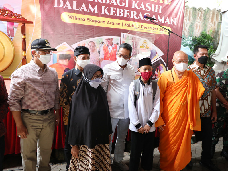 Penjabat (Pj) Gubernur DKI Jakarta, Heru Budi Hartono bersama Menteri Koordinator Bidang Politik, Hukum, dan Keamanan (Menko Polhukam), Mahfud MD menghadiri acara bakti sosial di Wihara Ekayana Arama, Jalan Mangga Dua, Duri Kepa, Jakarta Pusat, Sabtu (3/12). Usai menyerahkan bantuan, Heru bersama Mahfud MD juga berkesempatan meresmikan gedung Ekayana Grha Sakyaputra Mandiri yang berjarak tidak jauh dari wihara. (Foto: Reza Hapiz/beritajakarta.id)