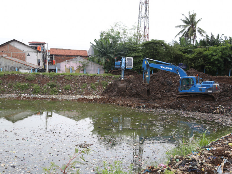 Suku Dinas Sumber Daya Air (Sudin SDA) Jakarta Timur terus mengebut pengerjaan pembangunan Embung Kramat Jati di Jalan Dato Tonggara, RW 11, Kelurahan Kramat Jati. Progres pembangunan embung seluas 5.000 m² tersebut saat ini sudah mencapai sekitar 65 persen. (Foto: Reza Hapiz/beritajakarta.id)