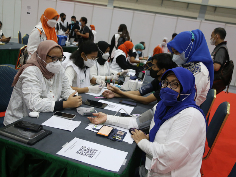 Peringatan Hari Kesehatan Nasional (HKN) ke-58 dijadikan momentum untuk membuat sistem kesehatan yang lebih kuat. Untuk mewujudkan hal tersebut, Dinas Kesehatan (Dinkes) DKI Jakarta mengajak masyarakat untuk ikut vaksin COVID-19 dosis ketiga atau booster yang digelar di Hall B, Jakarta Convention Center (JCC), Senayan, Jakarta Pusat pada 28-29 November 2022. (Foto: Reza Hapiz/beritajakarta.id)