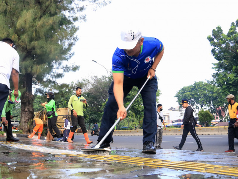 Ratusan personel lintas Organisasi Perangkat Daerah (OPD) melakukan aksi kerja bakti membersihkan trotoar di kawasan Grogol, Grogol Petamburan, Jakarta Barat, Minggu (27/11). Kerja bakti dilakukan sepanjang 1,2 kilometer, tepatnya dari depan ITC Roxi di Jalan Kyai Tapa hingga Universitas Tarumanegara di Jalan Letjen S Parman. (Foto: Reza Hapiz/beritajakarta.id)