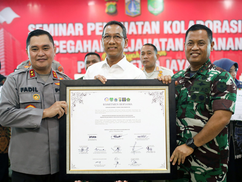 Penjabat (Pj) Gubernur DKI Jakarta, Heru Budi Hartono bersama Kapolda Metro Jaya, Irjen Pol Mohammad Fadil Imran dan Panglima Kodam Jaya, Mayjen Untung Budiharto menandatangani kesepakatan Pencegahan Bersama Masalah Kejahatan Jalanan di Gedung Balai Pertemuan Polda Metro Jaya, Jakarta Selatan, Kamis (17/11). Kesepakatan tersebut juga ditandatangani oleh Kepala Satpol PP Provinsi DKI Jakarta, Arifin; Kepala Dinas Pendidikan DKI Jakarta, Nahdiana; Kepala Dinas Sosial DKI Jakarta, Premi Lasari; Aster Kasdam Jaya, Stefie Jantje Nuhujanan; Dirbinmas Polda Metro Jaya, Badya Wijaya; Kepala Bapas Kelas I Wilayah Jakarta Barat, Sri Susilarti; Ketua KPAI, Susanto; dan Kepala Kanwil Kemenag Provinsi DKI Jakarta, Cecep Khairul Anwar. (Foto: Nugroho Sejati/beritajakarta.id)