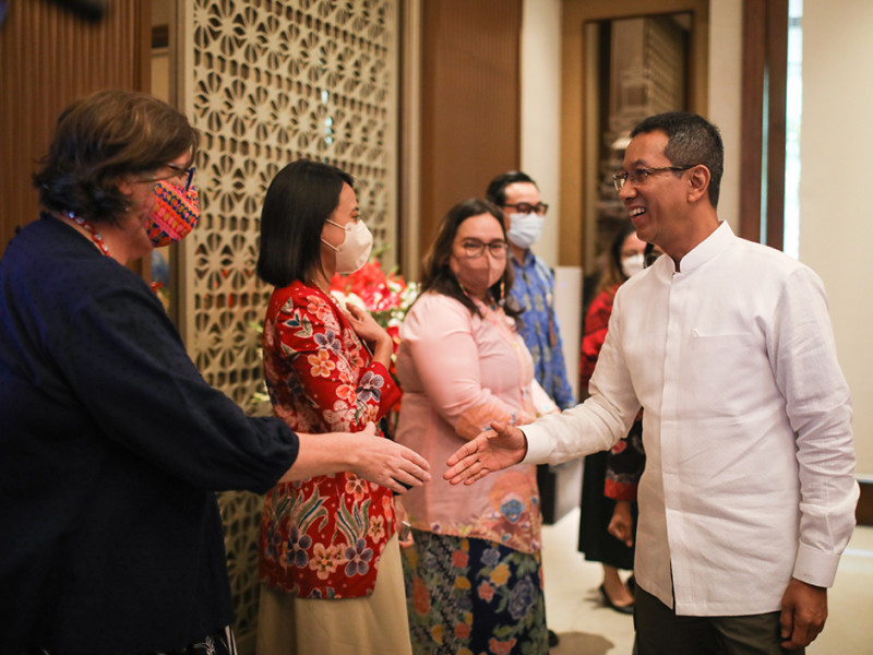 Penjabat (Pj) Gubernur DKI Jakarta, Heru Budi Hartono, menjamu 15 perwakilan mitra organisasi internasional di Plataran Hutan Kota Gelora Bung Karno (GBK), Tanah Abang, Jakarta Pusat, Jumat (18/11). Jamuan tersebut sebagai ajang silaturahmi dan dengar pendapat antara Pemprov DKI Jakarta dan mitra organisasi internasional. (Foto: Nugroho Sejati/beritajakarta.id)
