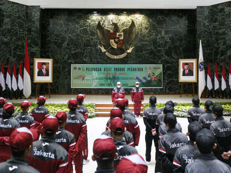 Sebanyak 197 Kontingen DKI Jakarta yang akan berkompetisi dalam Pekan Olahraga dan Seni Antar Pondok Pesantren Tingkat Nasional (Pospenas) IX Tahun 2022 resmi dilepas. Acara pelepasan dipimpin oleh Sekretaris Daerah (Sekda) DKI Jakarta, Marullah Matali di Balai Agung, Balai Kota Provinsi DKI Jakarta, Kamis (17/11). (Foto: Mochamad Tresna Suheryanto/beritajakarta.id)