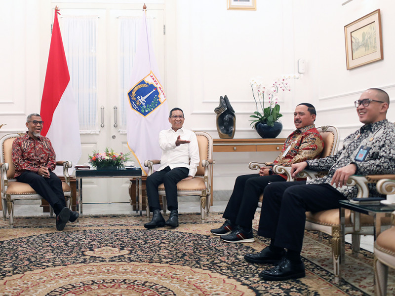 Penjabat (Pj) Gubernur DKI Jakarta, Heru Budi Hartono menerima kunjungan Direktorat Jenderal (Ditjen) Kekayaan Intelektual Kementerian Hukum dan HAM (KI Kemenkumham) RI di Ruang Tamu Utama Balai Kota DKI Jakarta, Gambir, Jakarta Pusat, Kamis (17/11). Kunjungan tersebut membahas program unggulan Kemenkumham RI yaitu Roving Seminar Kekayaan Intelektual dan Yasonna Mendengar yang akan diselenggarakan di Hotel Bidakara, Tebet, Jakarta Selatan dan Pos Bloc Jakarta, Jakarta Pusat pada 21 November 2022 mendatang. (Foto: Nugroho Sejati/beritajakarta.id)