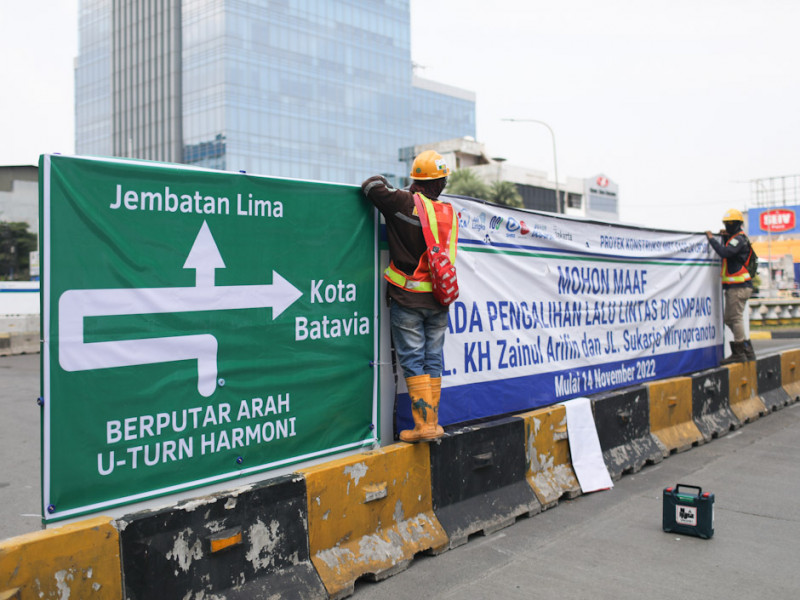Rekayasa lalu lintas (lalin) diberlakukan di simpang Jalan KH Zainul Arifin dan Jalan Sukarjo Wiryopranoto, Gambir, Jakarta Pusat, Senin (14/11). Kebijakan ini terkait proyek konstruksi MRT Fase 2A CP 202. (Foto: Nugroho Sejati/beritajakarta.id)