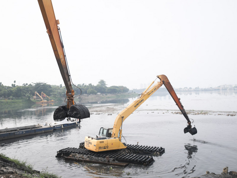 Petugas Suku Dinas Sumber Daya Air (Sudin SDA) Jakarta Utara mengeruk lumpur di Waduk Pluit, Kecamatan Penjaringan, Jakarta Utara, Minggu (13/11). Pengerukan ini dilakukan sebagai upaya meningkatkan kapasitas waduk. (Foto: Nugroho Sejati/beritajakarta)