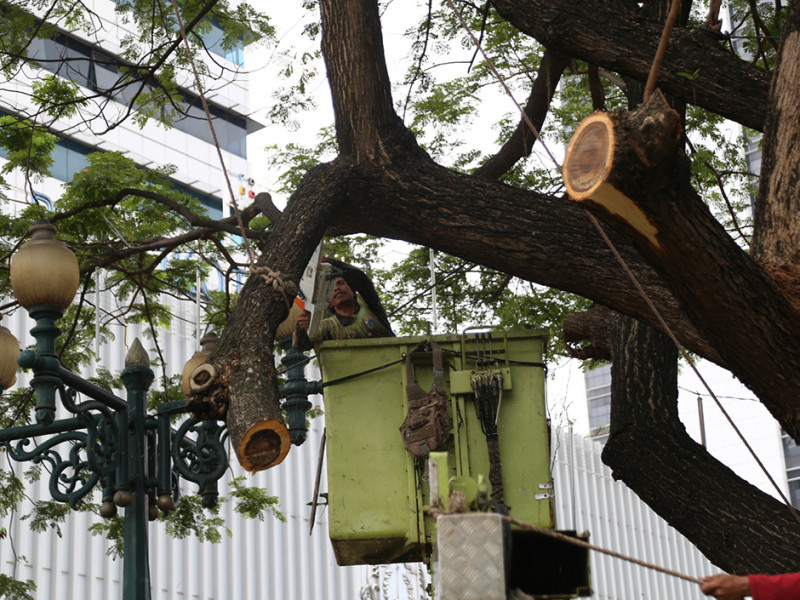 Puluhan personel Dinas Pertamanan dan Hutan Kota (Distamhut) Provinsi DKI Jakarta melakukan penopingan pohon-pohon di Balai Kota DKI Jakarta, Jalan Medan Merdeka Selatan, Gambir, Jakarta Pusat, Jumat (11/11). (Foto: Mochamad Tresna Suheryanto/beritajakarta.id)