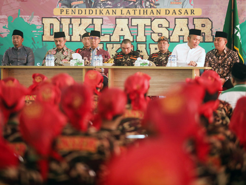 Penjabat (Pj) Gubernur DKI Jakarta, Heru Budi Hartono, memberikan sambutan sekaligus menutup rangkaian kegiatan Pendidikan dan Pelatihan Dasar (Diklatsar) Banser Akbar 2022 di Asrama Haji Pondok Gede, Makasar, Jakarta Timur, Minggu (30/10). Diklatsar yang diinisiasi oleh Pimpinan Wilayah Gerakan Pemuda (GP) Ansor DKI Jakarta itu diikuti sekitar 1.058 peserta. (Foto: Nugroho Sejati/beritajakarta.id)